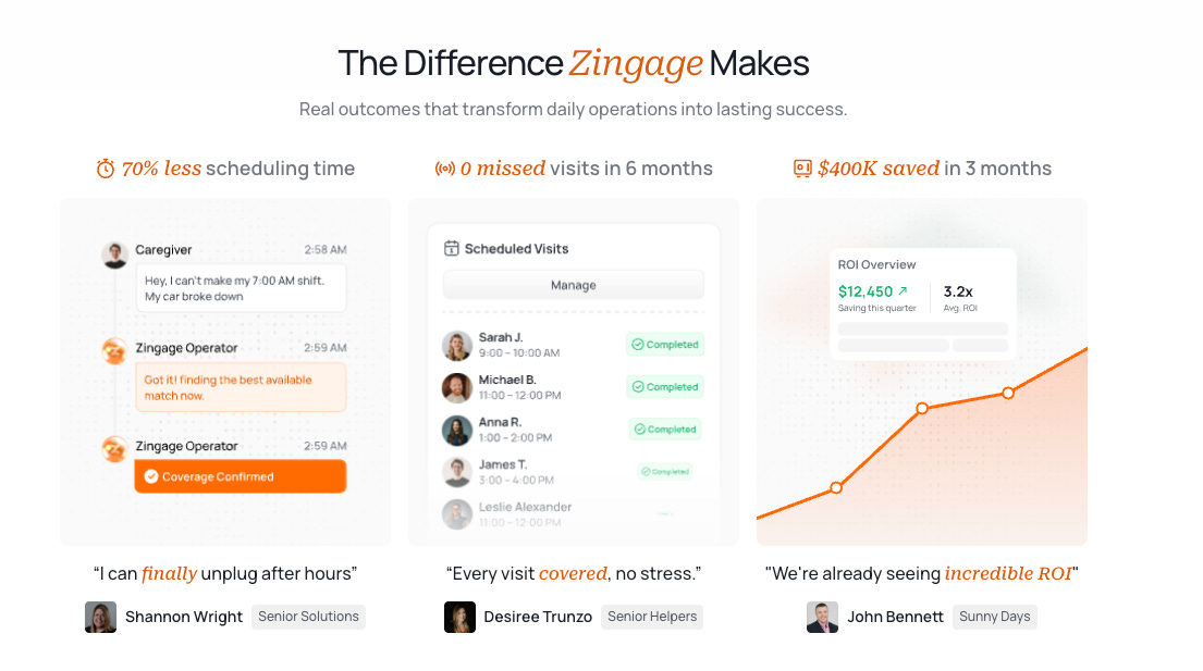 Zingage replaces that manual coordination with AI trained on real operational data. Operator learns from staffing patterns to predict gaps, optimize assignments, and communicate directly with caregivers and patients through voice AI. Shifts are filled before they fail, documentation is completed automatically for payers, and managers can handle twice the patient volume without burnout.