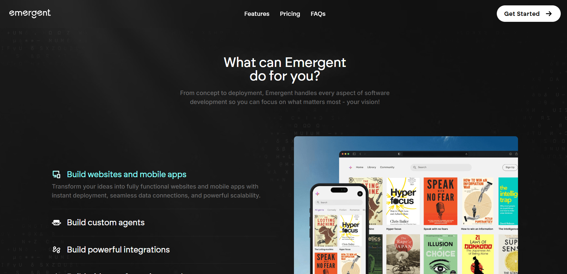 Emergent’s answer is a conversation-to-code platform. Agents handle planning, architecture, testing, debugging, and deployment. A builder can describe a product in chat and get a working application with live preview, GitHub integration, and secure hosting. The company claims full applications are delivered in under five minutes.